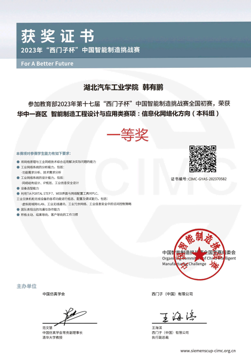 在学长的引领下,韩有鹏开始啃硬骨头——学习复杂的PLC编程与控制技术。备赛期,实验室成了他的第二个“家”。作为团队的核心技术人员,他与队友们开启了“日夜模式”:反复调试设备、优化算法、模拟实战。面对华中赛区众多强劲对手(华中科技大学、三峡大学、武汉理工大学等),压力如山。但他们凭借扎实的准备和临场的稳定发挥,硬是在强手如林的竞争中一举夺魁,斩获信息化网络化赛项华中赛区一等奖。这次胜利,不仅是一枚奖牌,更是对他专业能力和团队协作的强力认证,让他确信:“汗水浇灌之处,必有回响”。