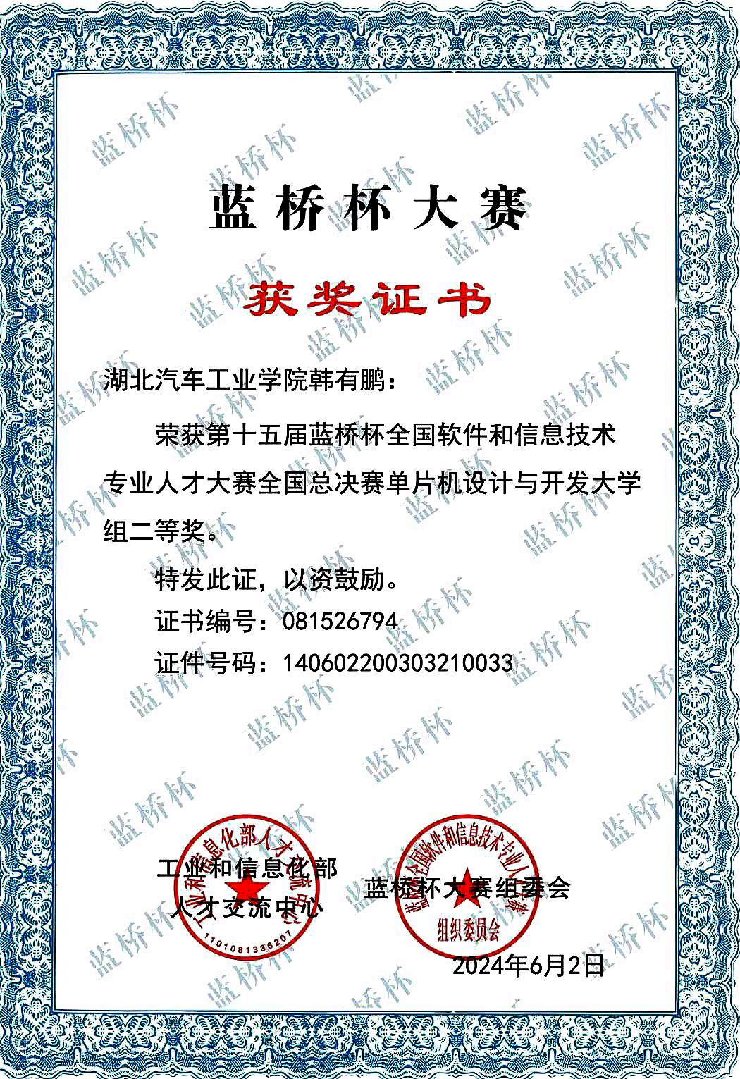 “西门子杯”的余热未散,韩有鹏又向第十五届“蓝桥杯”单片机设计与开发赛道发起冲击。与团队作战不同,这次是个人能力的全面考验。创新的思路设计、精密的程序编程、灵活多变的外设组合调试,每一项都需他独自深钻。备赛桌旁堆积如山的资料、屏幕上密密麻麻的代码、反复拆装调试的电路板,见证了他无数个“挑灯夜战”的时刻。灵活多变的外设组合常常带来意想不到的难题,知识点的深度与广度也让他压力倍增。“但放弃从不是选项”,他凭借在单片机领域积累的优势,在比赛现场沉着冷静,精准操控,最终将国家级二等奖收入囊中。这场“一个人的战斗”,让他深刻领悟到:“压力是成长的催化剂,专注是突破的通行证”。