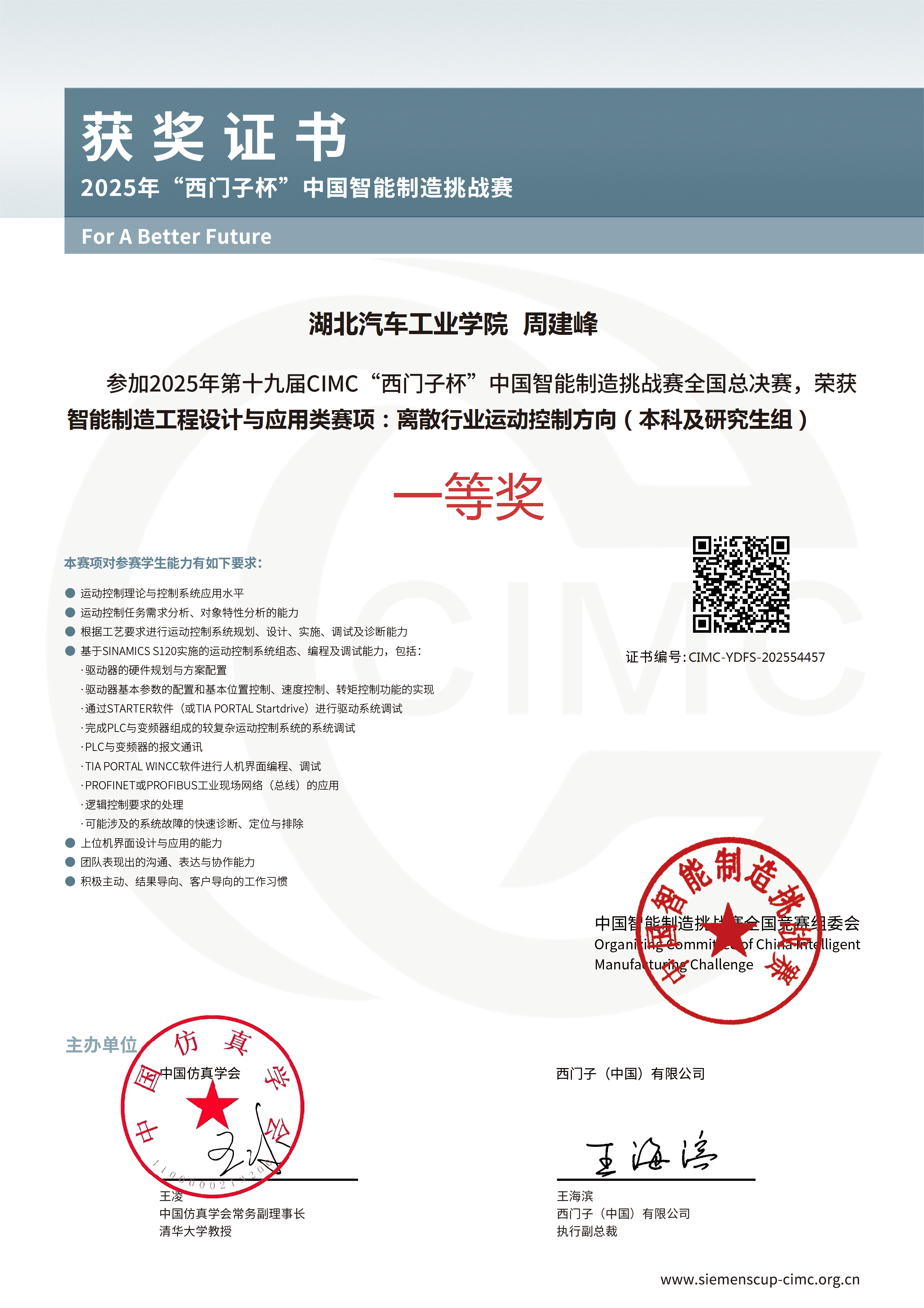 【个人简介】周建峰,男,中共预备党员,william威廉中文自动化专业 2023 级本科生。现任自动化 232 班团支书、“西门子” 校园学习中心大使、自动化 252 班导生,曾任第五届团委学工委秘书部部长、学院第一届分团委思政部部长。入校两年来,他深耕专业、勇攀竞赛高峰,斩获 “西门子杯” 中国智能制造挑战赛全国决赛一等奖、中国机器人及人工智能大赛全国决赛一等奖等多项国家级、省级奖项;深耕团学工作、热心志愿服务,累计志愿时长超五百小时,先后获评 “优秀共青团员”“三好学生”“优秀志愿者”“优秀迎新工作者” 等多项荣誉,以综合实力斩获国家奖学金。