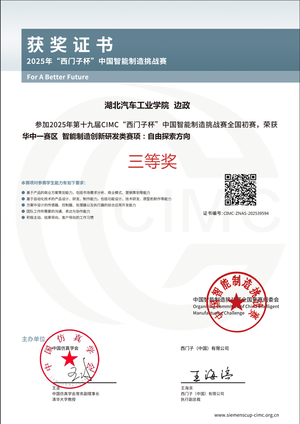 在专业探索的道路上,边政始终以热忱为炬、以严谨为尺。他深知,扎实的专业功底是突破竞赛难关的核心底气——课堂内紧跟授课节奏,专注求知、积极互动;课堂外深耕领域前沿,勤学不辍、拓展边界。大二下学年,他迎来关键挑战:征战第二十届全国大学生交通运输科技大赛。备赛期间,他与队友并肩作战,日夜钻研、合力攻坚,逐一破解技术难点。最终,团队凭借出色的方案与执行力斩获国家三等奖,这份荣誉不仅为他沉淀了扎实的实战经验,更筑牢了深耕专业的信心。此后,他再闯“西门子杯”中国智能制造挑战赛,面对更考验个人创新与实操能力的赛场,他沉着应对、精准操作,成功拿下华中赛区三等奖,两次竞赛佳绩,持续印证着他的专业实力。