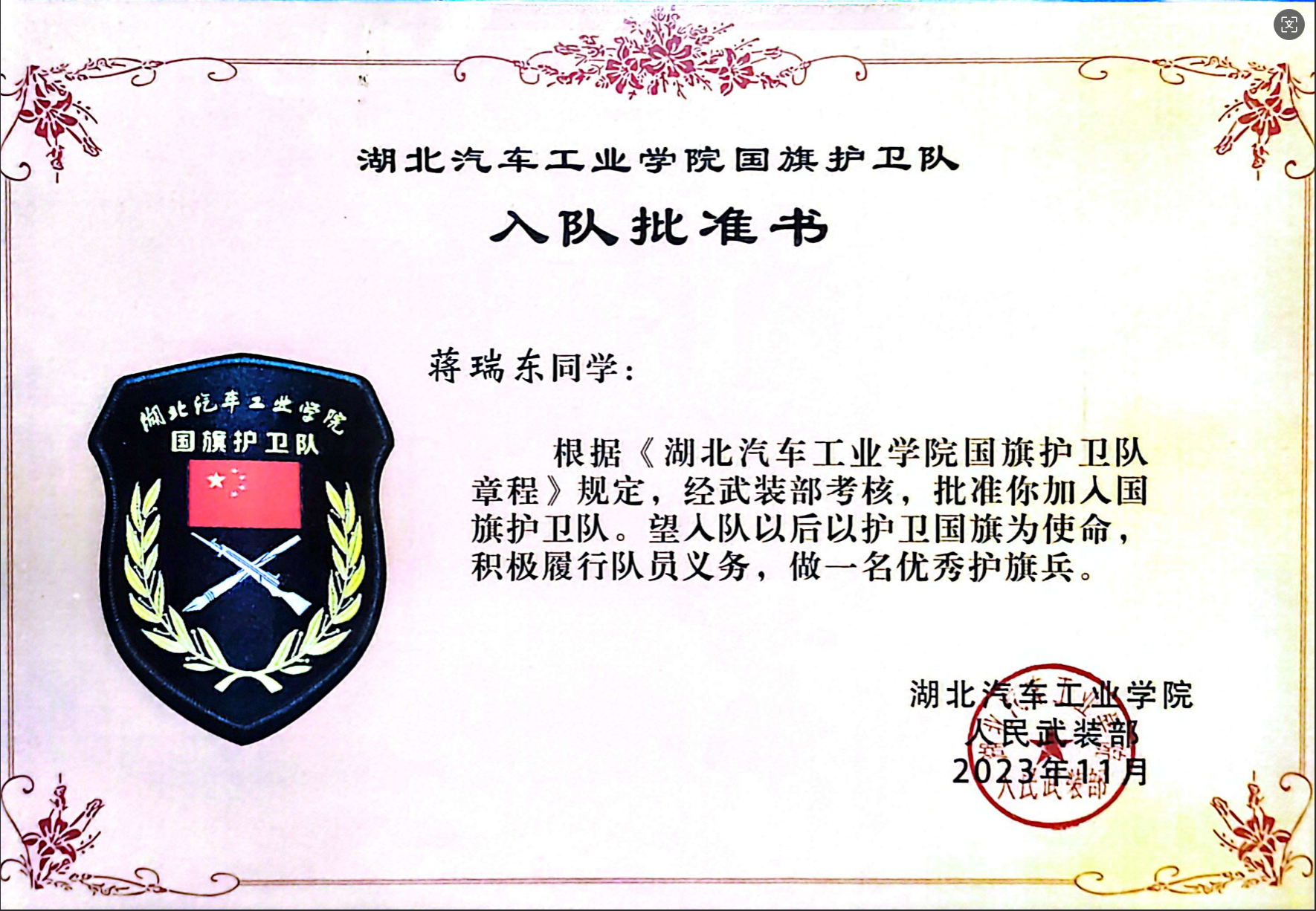 怀着对国旗的无限崇敬,蒋瑞东在大一伊始便加入了国旗护卫队。自加入国护起,他便将“护卫国旗”作为一份光荣的使命。日复一日的刻苦训练,汗水浸透衣衫,他从未退缩,最终通过严格考核,光荣地成为第19届国旗护卫队正式队员。在队期间,他多次承担学校重大活动的升旗任务,以挺拔的军姿、整齐的步伐和饱满的精神状态,完美地护卫着国旗,将爱国情怀融入每一次升旗仪式中。训练场上,他与队友们是并肩作战的战友;训练之余,他们互相关心、共同成长,是朋友更是家人。这种深厚的战友情谊,成为他大学生活中宝贵的财富。他还先后两次参加暑假集训,不仅锤炼了个人意志,更深刻体会到了“传承”的意义——将从前辈那里学会的动作要领、队列精神,毫无保留地传授给新队员,完成了从“学会”到“教会”的角色转变。因其出色的表现和过硬的本领,他被选拔担任第25届新生军训教官,以身作则,将国旗护卫队的优良作风传递给新生,展现了出色的组织能力和责任感。